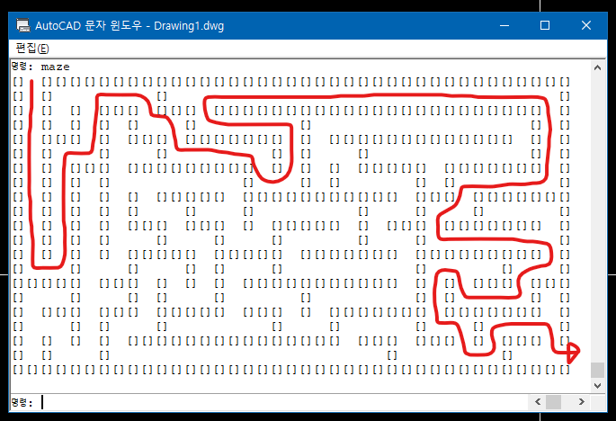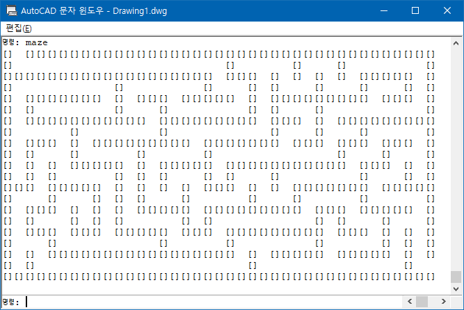 실행 명령어는 MAZE 입니다. 역시나 defun c: 다음에 나오는 영어가 실행명령어 입니다. 잊지않으셨죠? 명령어를 적기 전에 F2를 눌러서 오토캐드 문자윈도우를 띄워주도록 합니다. 이 게임은 문자윈도우에 미로가 나오거든요.