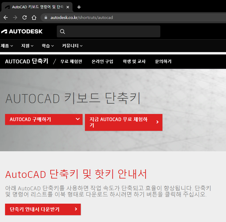 오늘은 오토데스크 공식홈페이지에서 다운받을 수 있는 'AutoCAD 단축키 및 핫키 안내서'에 나와있는 내용 중에서 핫키에 대해서 다뤄보도록 하겠습니다. 수 많은 핫키가 있지만 실제로 자주 사용하게 되는 핫키는 몇개 되지 않습니다. 무슨 키가 어떤기능인지 다 아는것도 좋긴 하지만, 효율적으로 빨리 하려면 자주 쓰는 것, 많이 쓰는것만 아는게 좋습니다. 왜냐면 너무나도 많은 단축키와 명령어, 핫키들이 있기 때문입니다. 그래서 제가 자주 사용하는 핫키 위주로 알려드리도록 하겠습니다.