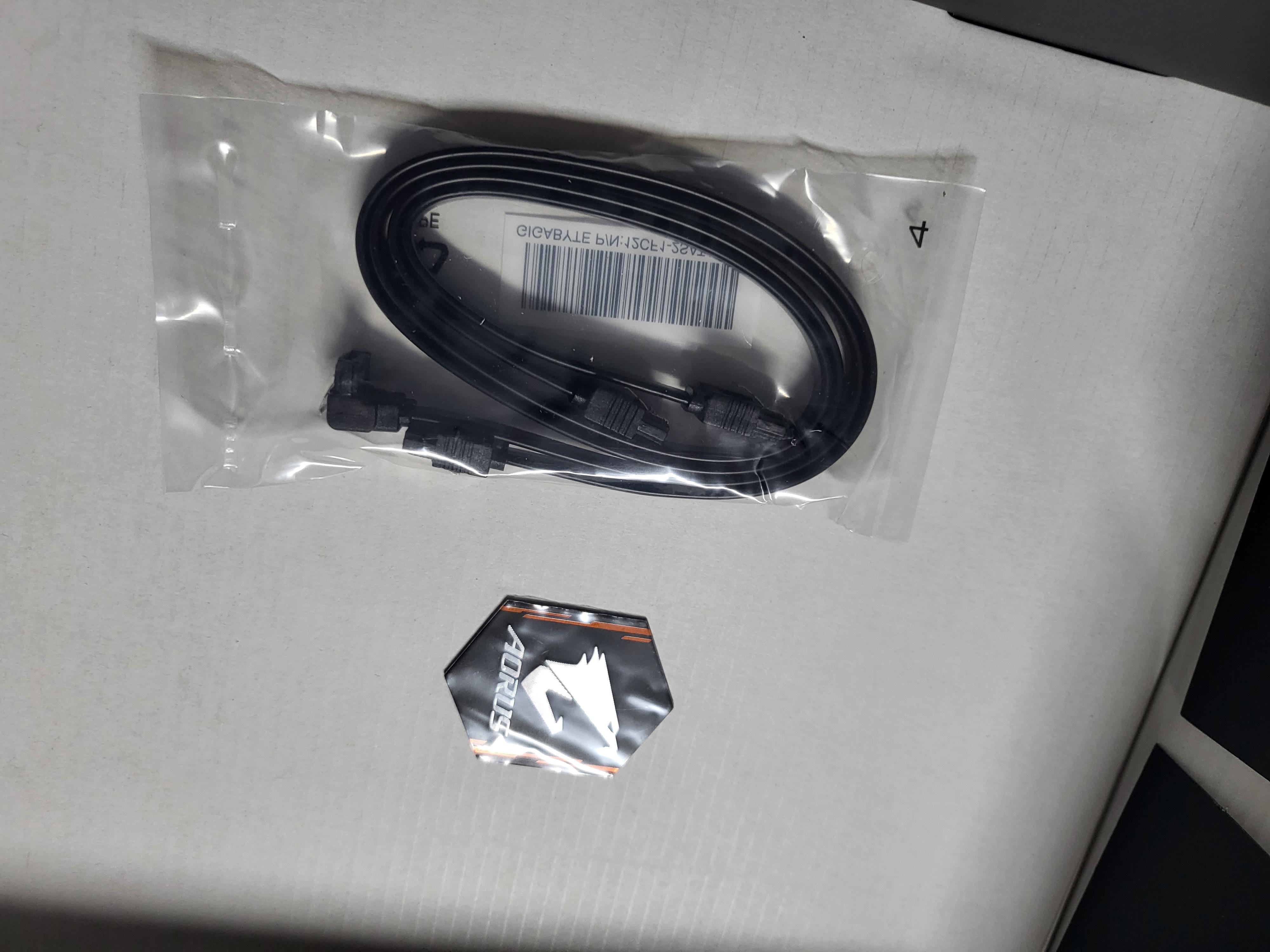 구성품은 케이블과 AORUS 스티커가 붙어있는 금속과 제품설명서가 있습니다.
